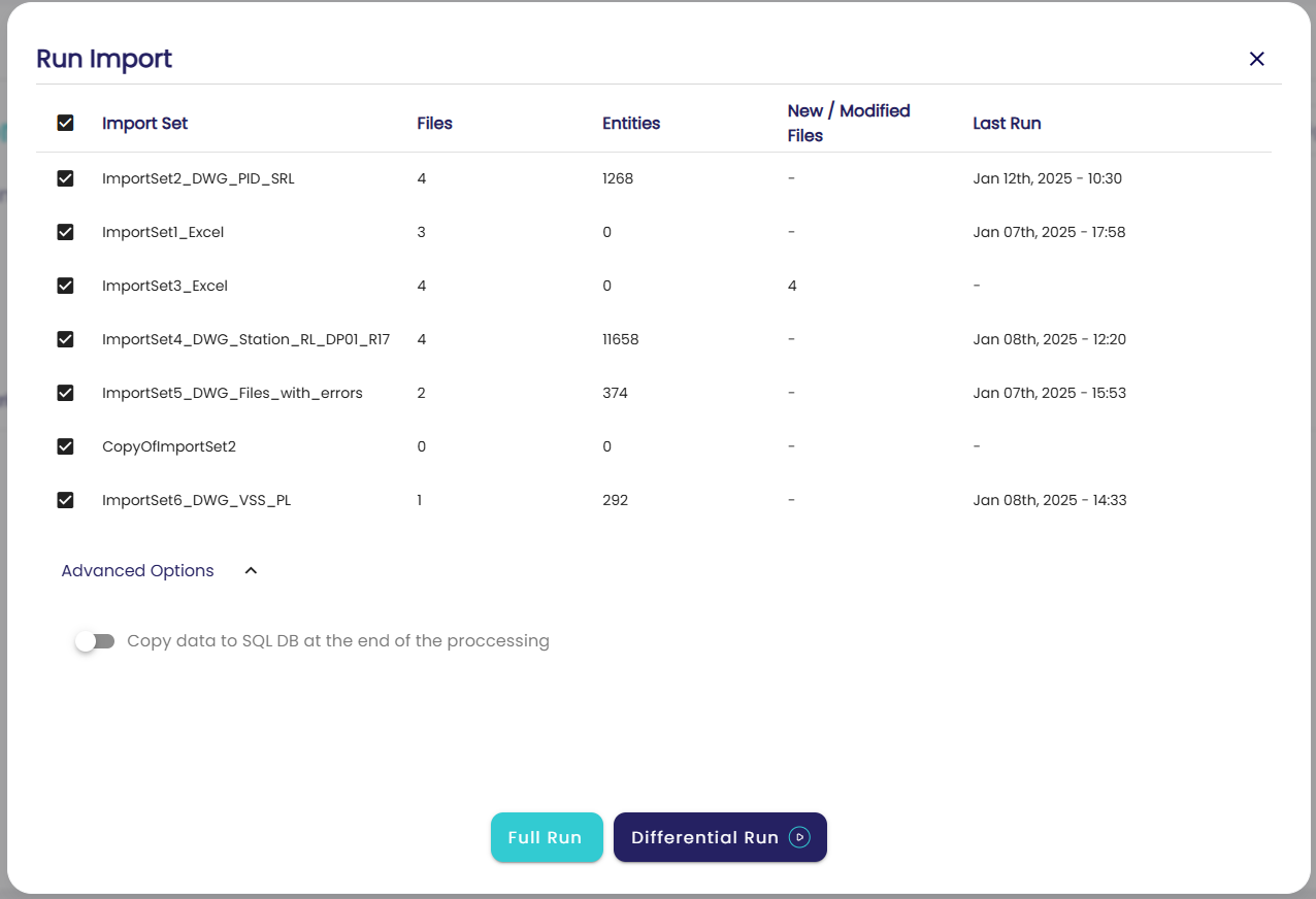 Full - It consists in processing again all the files included in the import set, despite the fact that they might had been processed already in the past.